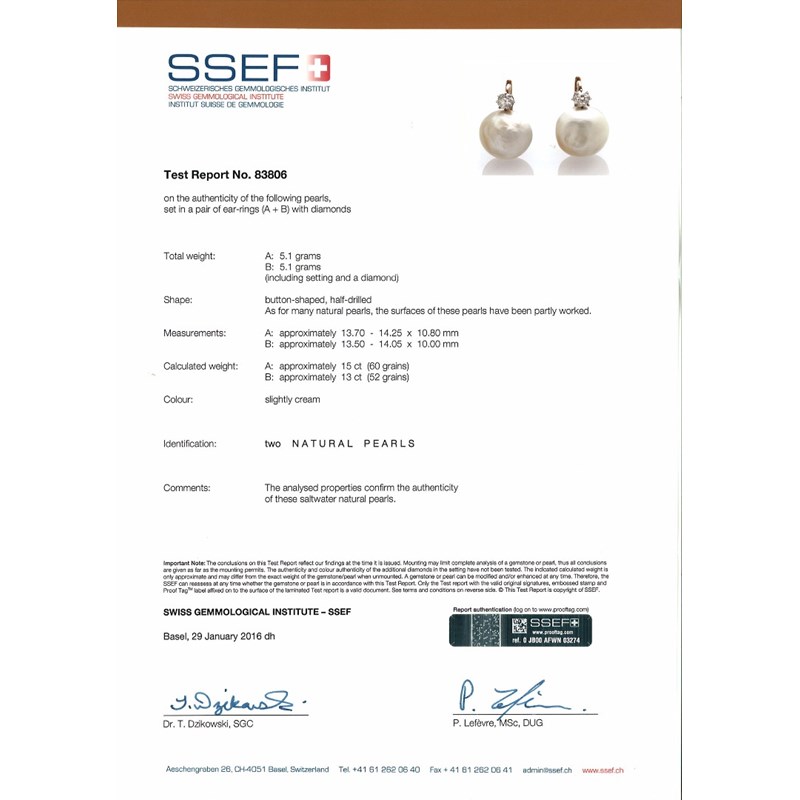 Accompanied by report number 83806 dated 29th January 2016 from SSEF, Switzerland stating that the button-shaped half-drilled pearls, with partly worked surfaces measure 13.70 - 14.25 x 10.80mm and 13.50 - 14.50 x 10.00mm and weigh 15ct and 13ct, are slightly cream in colour and both are natural saltwater pearls.