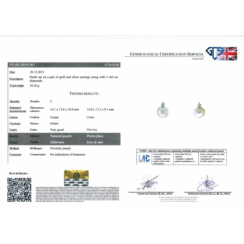 Accompanied by report number 5776-4106 dated 18th December 2015 from GCS, London stating that the cream pearls measure 14.1 x 13.6 x 10.6mm and 14.0 x 13.3 x 9.1mm and are natural saltwater pearls.