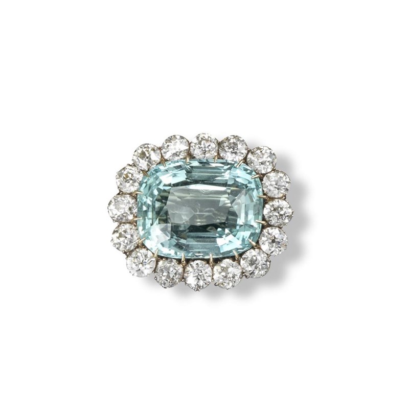 A late 19th century aquamarine and diamond cluster brooch, the large cushion-shaped aquamarine weighs approximately 26.00cts and is set within a surround of circular cut diamonds weighing approximately 5.50cts in total, set in silver and gold. 3.3cm wide.