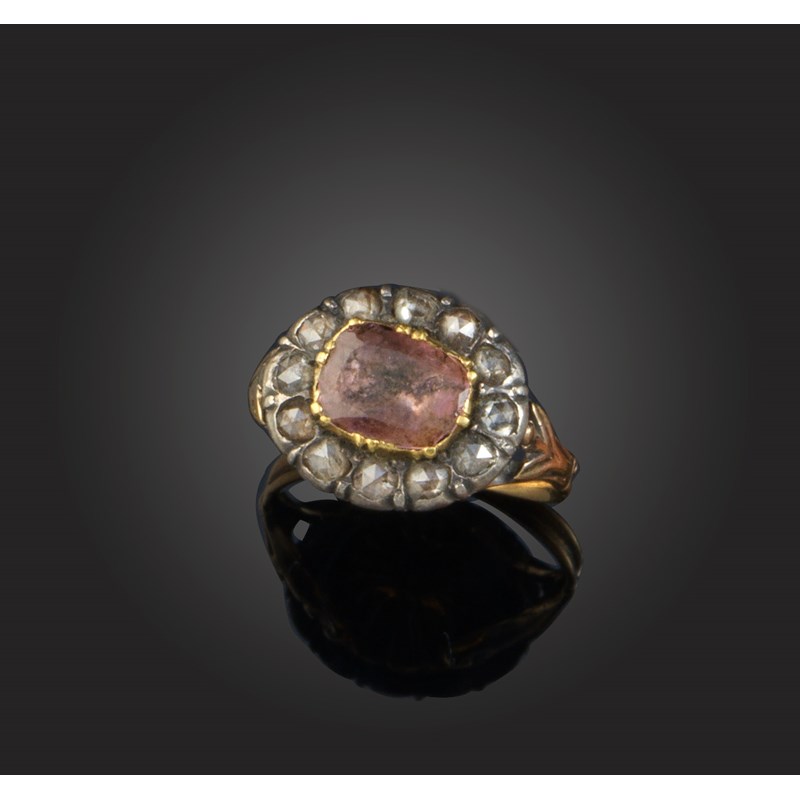 A spinel and diamond cluster ring, early 19th century, set with a cushion-shaped spinel within a surround of diamonds in silver and gold closed-back setting, size K