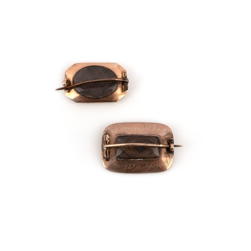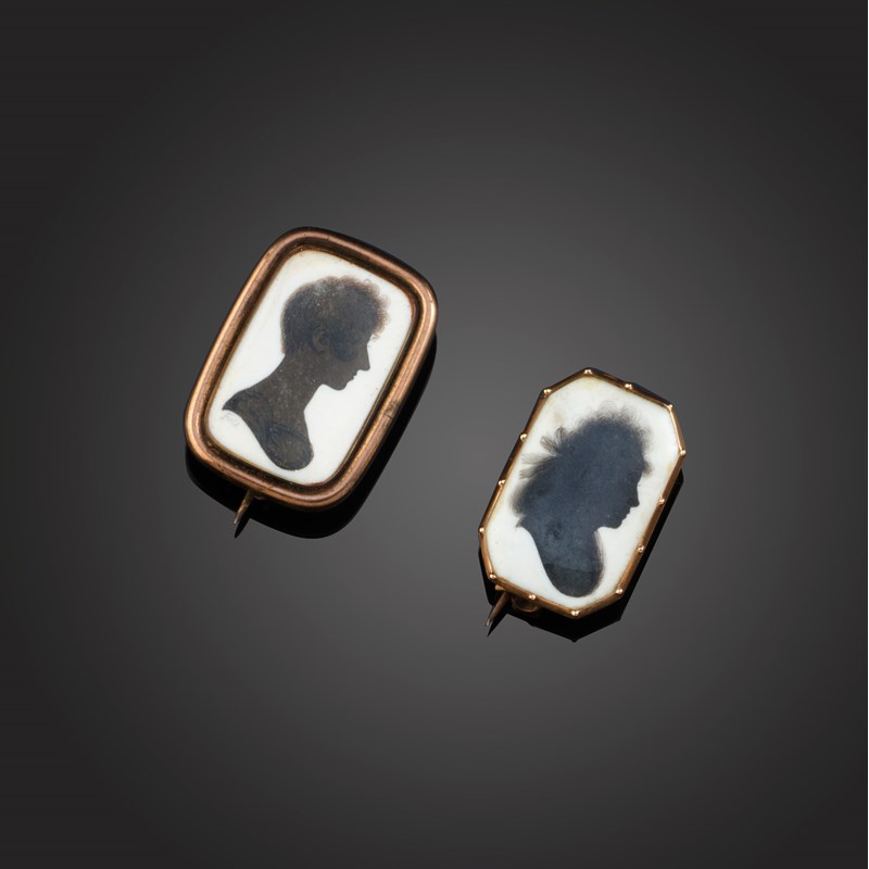 Miers & Field, an early 19th century silhouette portrait brooch, signed Field, in plain gold frame with inscription to reverse for Charlotte Perkins dated 1809, length 2.6cm, with another early 19th century silhouette portrait brooch in plain gold frame with woven hair in glazed locket compartment to reverse, length 2.3cm