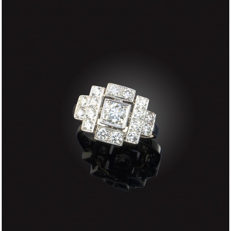 A diamond cluster ring, of geometric design set with graduated circular-cut diamonds in platinum,