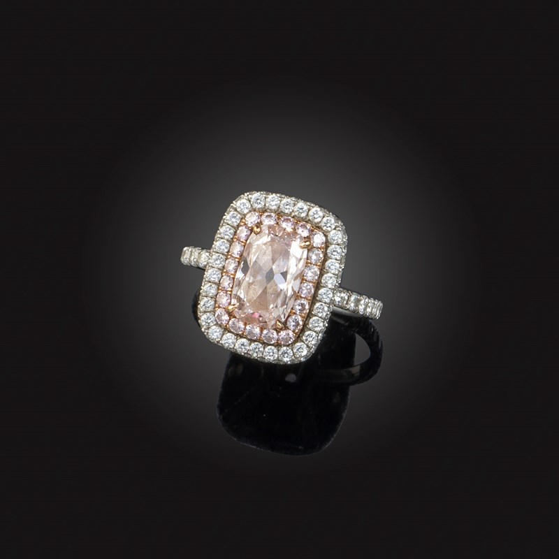 A fancy diamond cluster ring, the central cushion-shaped diamond of pink tint weighing 1.28cts set