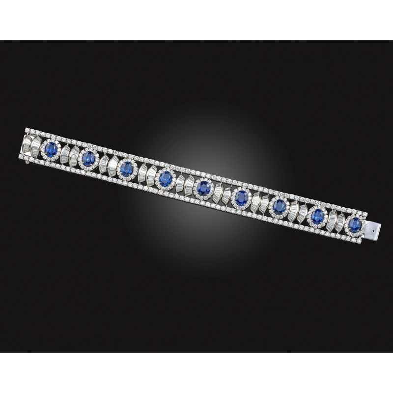 A sapphire and diamond bracelet, set with oval-shaped sapphires within diamond surrounds separated with arcs of tapered baguette-shaped diamonds within diamond borders in white gold, sapphires 13.79cts, diamonds 15.94cts, stamped 750, length 18.3cm