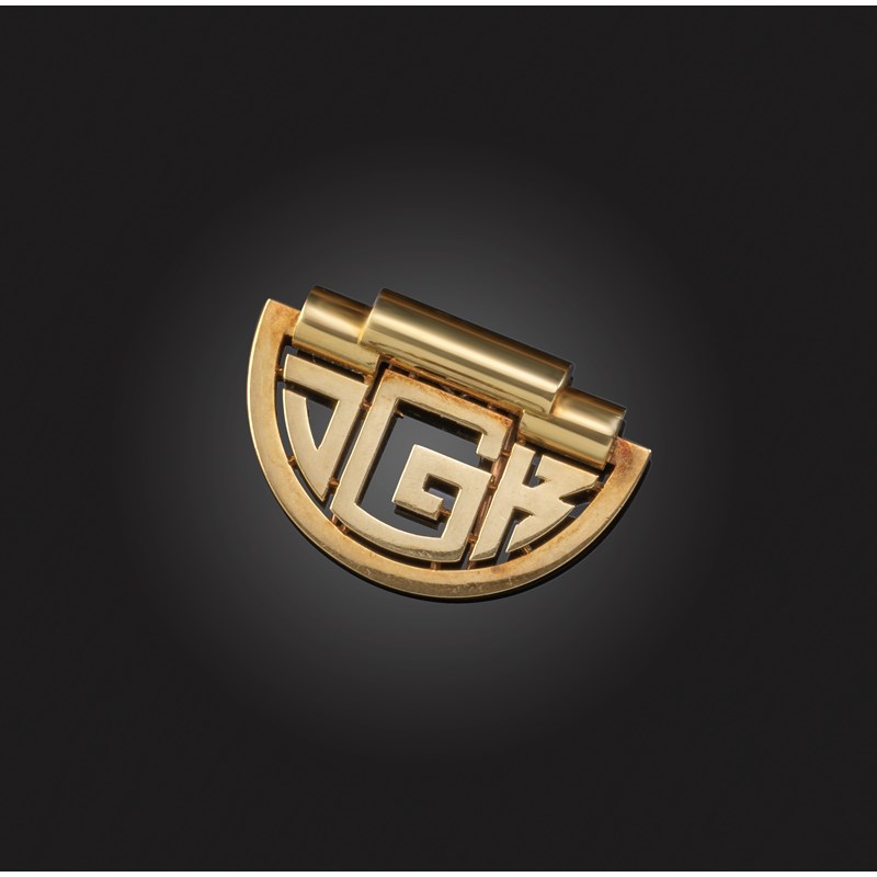 Cartier, an Art Deco gold clip brooch, 1930s, of fan-shaped outline, centring on the stylised initials JGK, length 4.1cm, signed Cartier London, numbered W.1196, gross weight 14 grams
