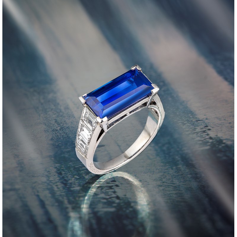 Boucheron, a sapphire and diamond ring, set with a baguette-shaped sapphire weighing 4.969 carats,