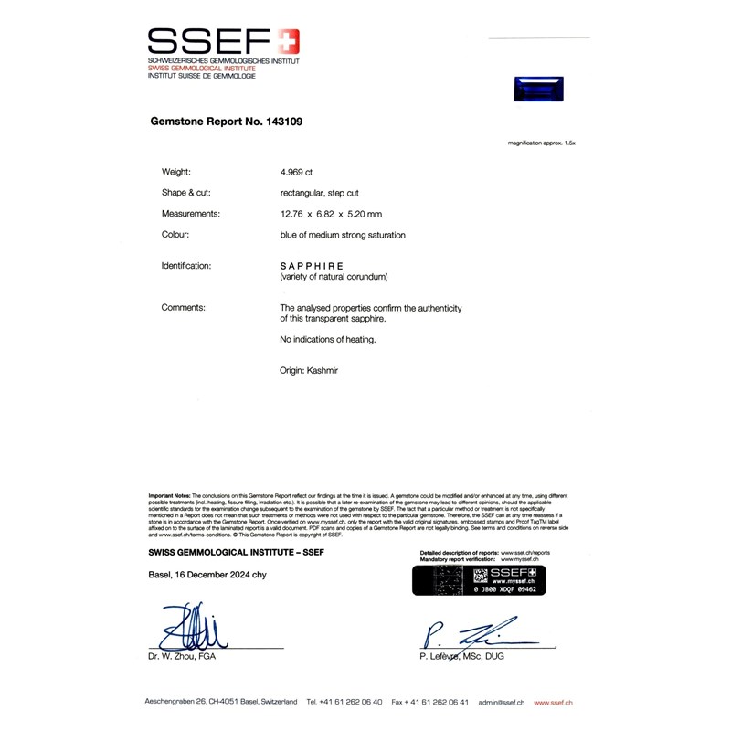 Accompanied by report number 143109 from SSEF dated 16th December 2024 stating that the sapphire shows no indication of heating, origin: Kashmir