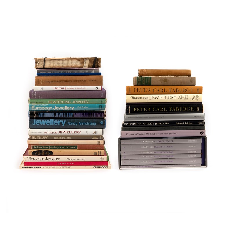 A collection of jewellery reference books, comprising thirty books, including Sah Oved, Book of Necklaces; Henry Charles Bainbridge, Peter Carl Fabergé; David Bennett and Daniela Mascetti, Understanding Jewellery; John M Gray, James and William Tassie; and Christie's, The Collection of Elizabeth Taylor, boxed catalogue collection, and Jewels from the Personal Collection of Princess Salimah Aga Khan