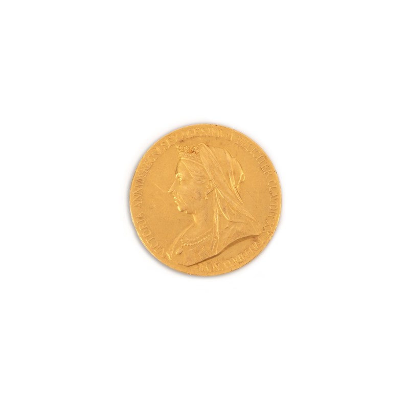 A gold Victorian 'Diamond Jubilee' medallion, 1897, one side with the young Queen Victoria in profile among sprays of leaves, the other with the older Queen Victoria in tiara and headdress, in high-carat gold, 2.5cm diameter, gross weight 12.9 grams