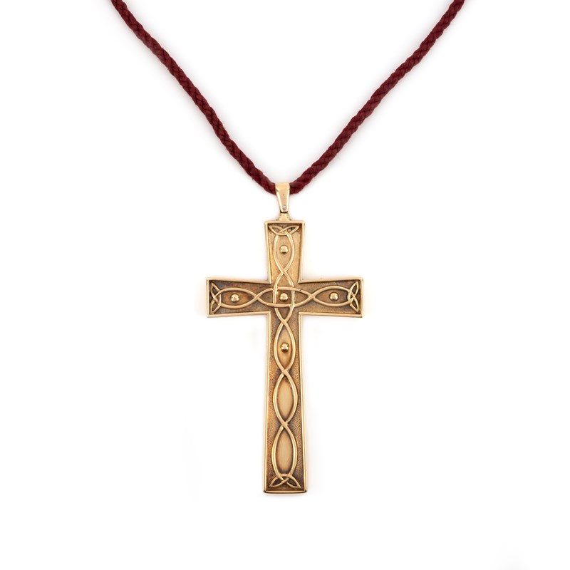 Attributed to Howard Brown, an episcopal gold pendant, circa 1949, designed as a gold cross decorated on each side with scrollwork of Celtic inspiration, inscribed 'Launcelot e Dono, EMF, October 18th 1949', to a bail fitting and red cord necklace, pendant length 8.6cm, total gross weight 32 grams