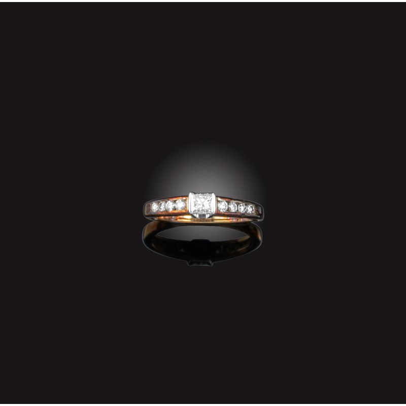 A diamond half hoop ring, set with a princess-cut diamond within round brilliant-cut diamond shoulders in 18ct yellow gold, size O