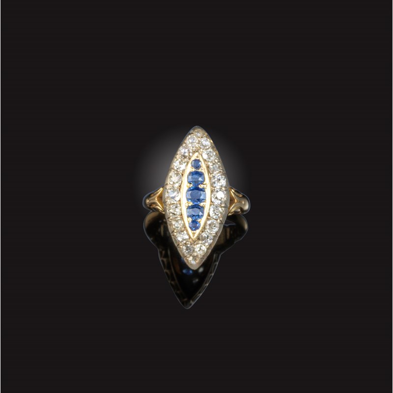 A sapphire and diamond ring, early 20th century, of navette-shaped outline, centring on a line of