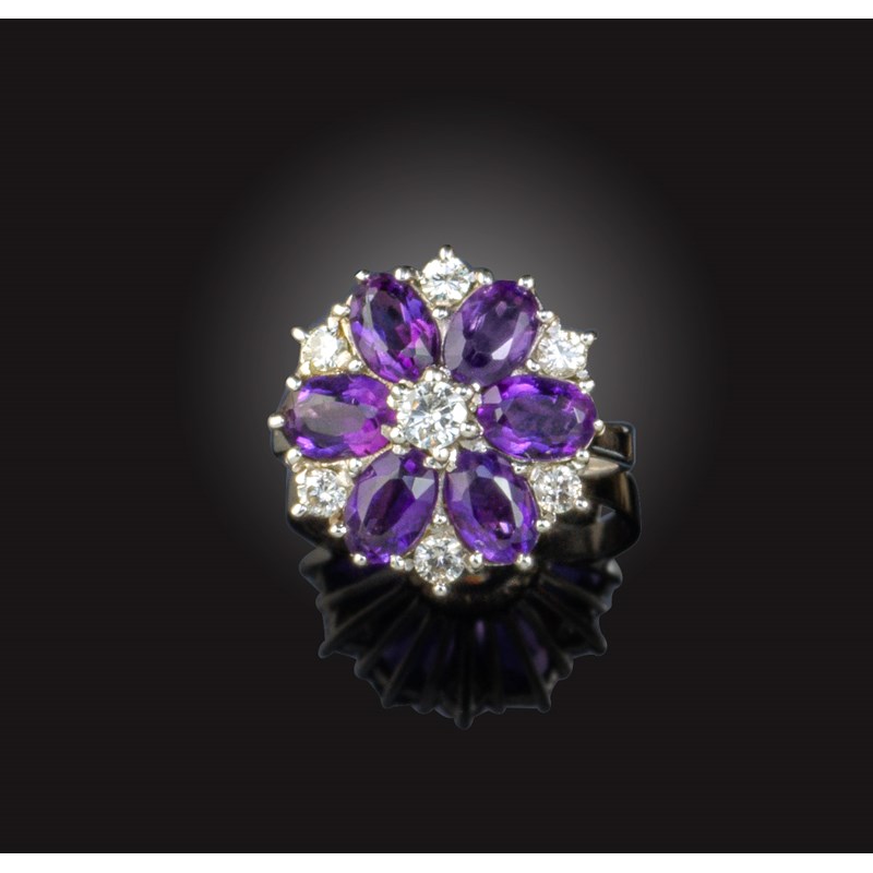 An amethyst and diamond ring, designed as a floral cluster of brilliant-cut diamonds and oval