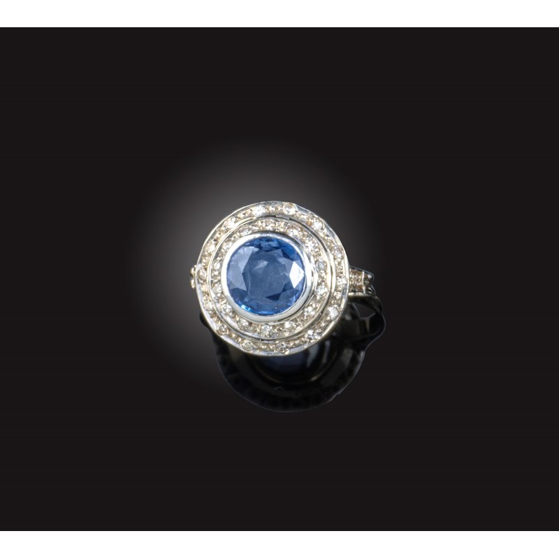 A sapphire and diamond ring, set with a central circular-cut sapphire within surrounds of single cut