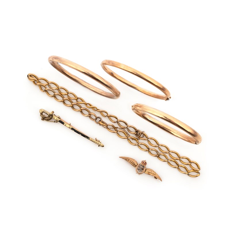 A collection of gold jewels, comprising: three gold bangles of hinged design, a gold and black enamel brooch designed as a sword, stamped 14CT; a section of gold chain, length 34cm; and a gold Royal Navy Fleet Air Arm regimental brooch, length 4.3cm, stamped 9ct, combined gross weight 57 grams