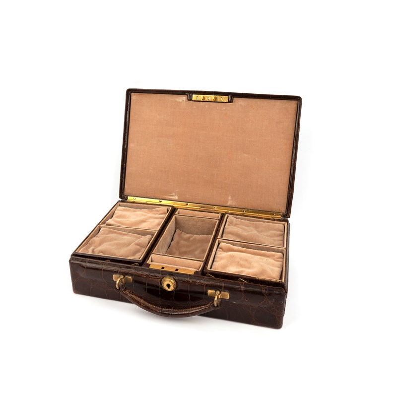 λ Goldsmiths and Silversmiths Company, a jewellery case, mid 20th century, of rectangular outline with carrying handle, in brown crocodile leather, opening to reveal an interior composed of compartments lined in taupe velvet, two tiered stacks of compartments opening outwards at each side, measuring 25 x 30.5 x 8cm including handle, interior signed Goldsmiths & Silversmiths Company Ltd, key deficient