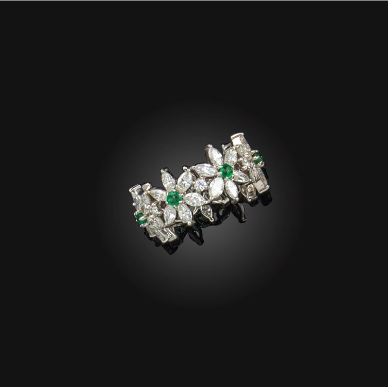 An emerald and diamond full circle eternity ring, designed as diamond-set flowerheads, each centring