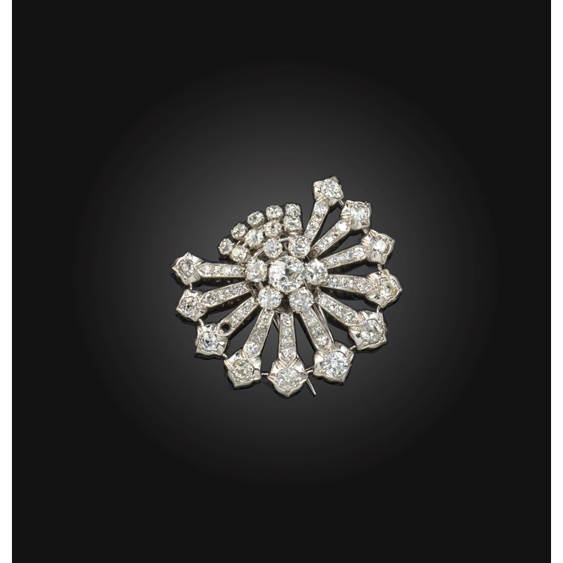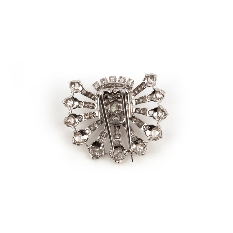A diamond clip brooch, 1930s, of fan-shaped design, set with circular-cut diamonds, mounted in