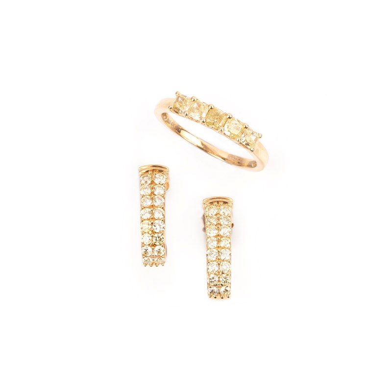 A diamond ring and pair of earrings, comprising: a ring set with a sequence of five radiant-cut diamonds of yellow tint, mounted in 14ct gold, size P1/2, British hallmarks for 14ct gold, maker's mark SD; and a pair of earrings, each pavé-set with brilliant-cut diamonds of pale yellow tint, mounted in 9ct gold, length 1.7cm each, post fittings, British hallmarks