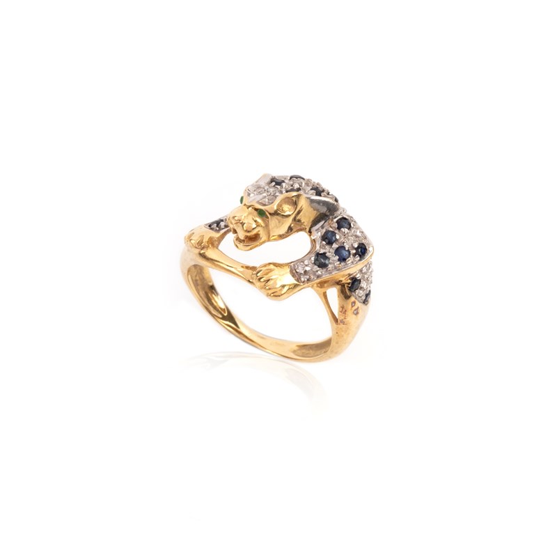 A sapphire and diamond ring, modelled as a panther, set with circular-cut sapphires and single-cut diamonds, its eyes set with green paste, mounted in gold, size N