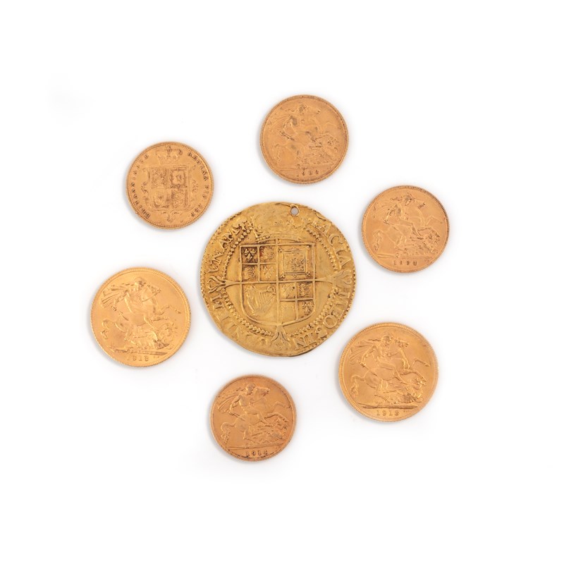 A collection of gold coins, comprising: a James I 20 shilling coin with laureated bust and crowned coat of arms, circa 1620s, drilled; two George V sovereign coins, each dated 1913; a Victorian half sovereign, dated 1883; two Edward VII half sovereigns, dated 1904 and 1908; and a George V half sovereign, dated 1914, combined gross weight 40.9 grams