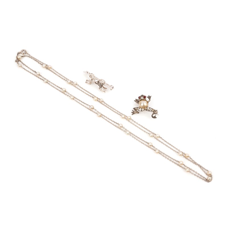 A group of jewels, early-mid 20th century, comprising: a platinum longchain threaded with seed pearls, length 81cm, pearls untested; a platinum brooch designed as a ribbon bow set with circular-and rose-cut diamonds, length 3.2cm; and a paste and imitation pearl brooch designed as a frog