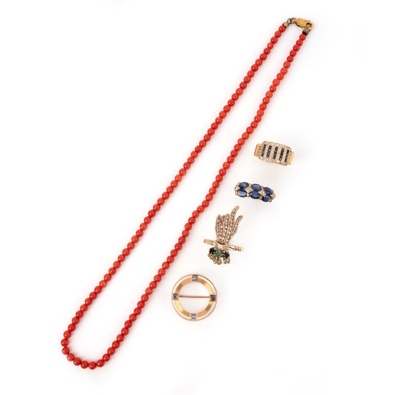A group of jewels, comprising: a calibré-cut sapphire and brilliant-cut diamond ring of geometric design, mounted in gold, size L1/2 (sizing beads); a ring designed as a hand, set with rose-cut diamonds, circular-cut sapphires and emeralds, mounted in gold, size R1/2; a coral bead necklace, length 46cm, clasp stamped 925; a sapphire and diamond ring mounted in 9ct gold, size N1/2, British hallmarks; and a circular gold brooch set with circular-cut sapphires, 2.5cm diameter, fitted case stamped J Hardy