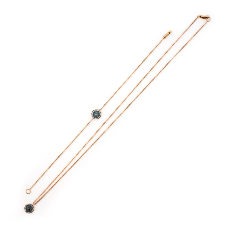 Annoushka, a diamond demi-parure, comprising: a necklace and bracelet, each centring on a circular 'Evil Eye' motif set with concentric arrangements of brilliant-cut diamonds and artificially irradiated blue diamonds, centring on a rose-cut black diamond, to a fine link gold chain, bracelet length 18cm, necklace length 42cm, each signed Annoushka, British hallmarks for 18ct gold