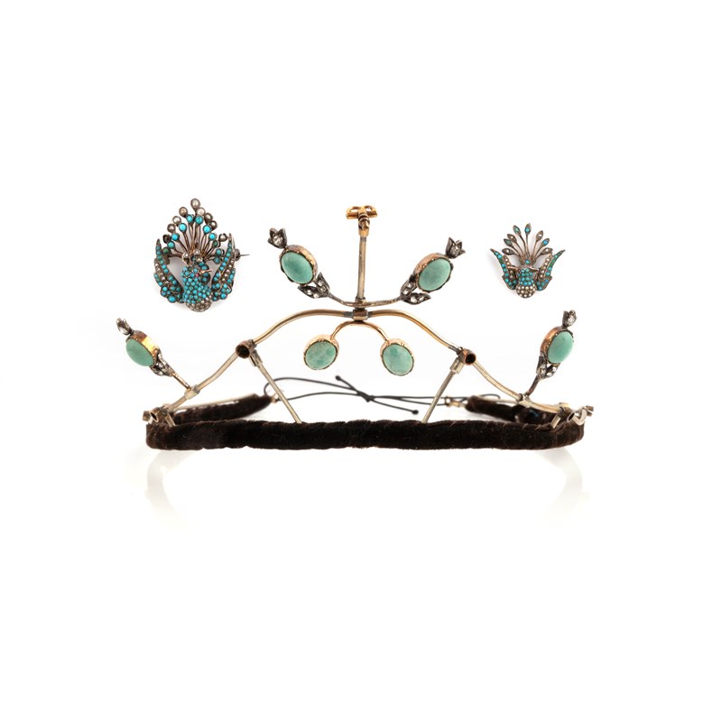 A turquoise and diamond tiara and pair of brooches, late 19th century, the tiara set with foliate spikes of turquoise cabochons and cushion-shaped and rose-cut diamonds, mounted in silver and gold on a steel frame, inner curve 39cm, height at centre 6cm, several detachable elements deficient; together with two brooches designed as birds in flight, pavé-set with turquoise cabochons and seed pearls, their eyes set with rubies, mounted in silver, 3.3 and 2.2cm respectively