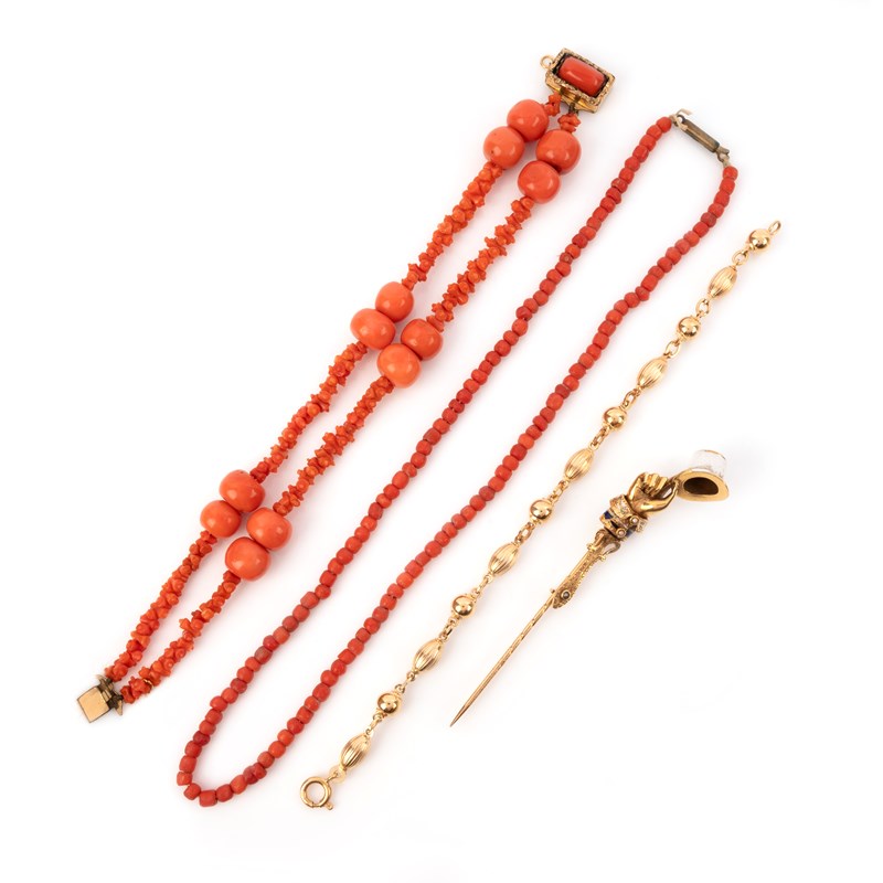 λ A collection of jewels, comprising: a late 19th century gold and enamel stick pin depicting a hand holding a top hat, length 8.4cm; a gold bracelet composed of spherical and fluted links, length 16.5cm, Italian maker's mark 1 AR, stamped 750; and a coral necklace and bracelet, lengths 18cm and 39cm
