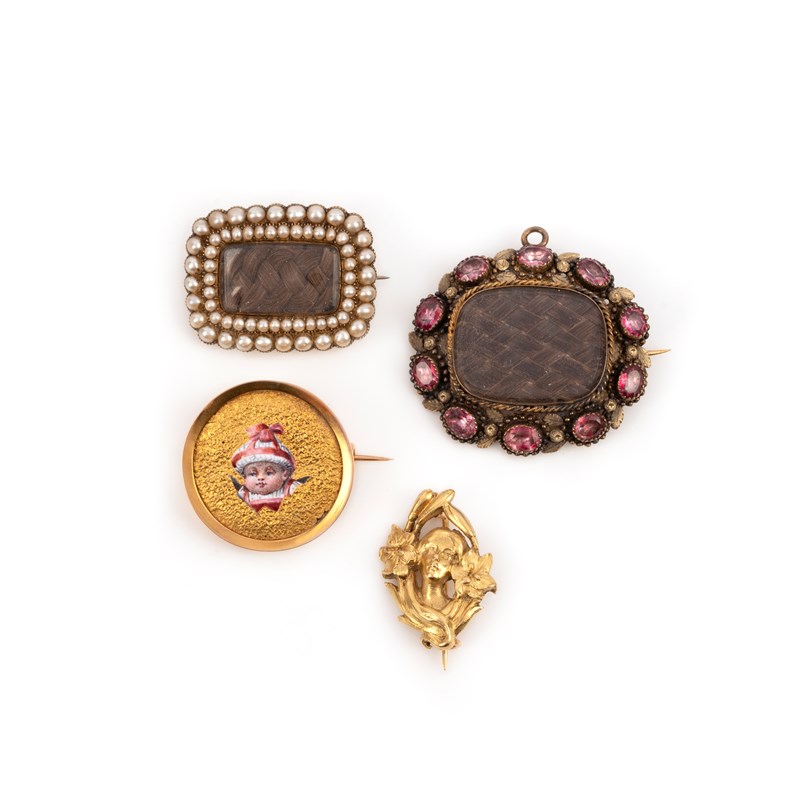 Four brooches, 19th and 20th century, comprising: a brooch of rectangular outline, set with half pearls and centring on a glazed compartment of woven hair, mounted in gold, length 2.9cm, pearls untested; a similar brooch of foliate design centring on woven hair, set with pink foiled rock crystal, the reverse with a dedicatory inscription, mounted in gilt metal, length 3.8cm; a gold brooch of Art Nouveau inspiration, designed as a woman among foliate scrolls, length 2.5cm; and a circular brooch centring on a panel of gilt metal with an enamel miniature of a child in a bonnet, within a polished gold frame, 2.5cm diameter