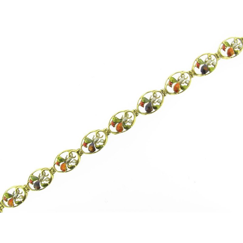 An Art Nouveau gold bracelet. Each foliate link with enamel decoration and set with a small circular cut diamond. 18.5cm long.