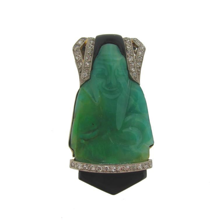 An Art Deco carved jade Buddah clip. Set with circular cut diamonds and black onyx sections in white gold. 4cm long.