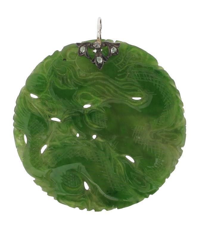 A circular carved and pierced jade disc pendant. Depicting a dragon to one side and birds to the other. The pendant loop set with rose cut diamonds. 5.2cm wide.