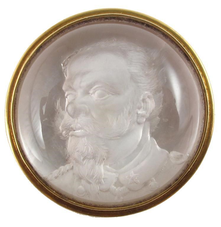 A 19th Century gold brooch, mounted with an unpainted reverse carved crystal depicting a General's head and shoulders. 3cm wide.
