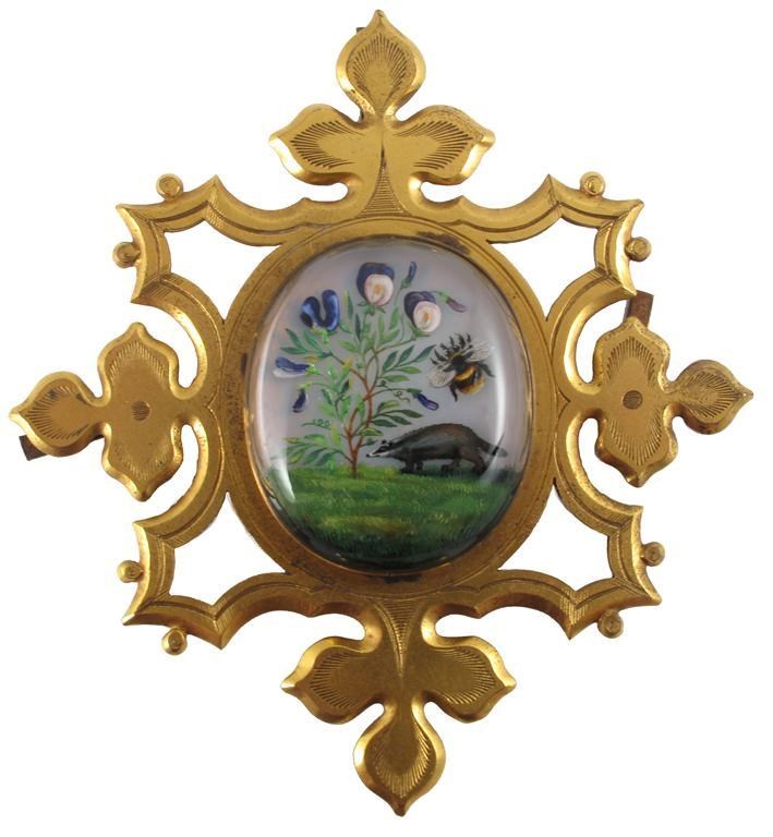 A 19th Century reverse carved crystal. Of oval form and depicting a bumble bee, badger and vetch plant. 4cm high, in an ornate engraved gilt metal scroll frame, 10cm high.