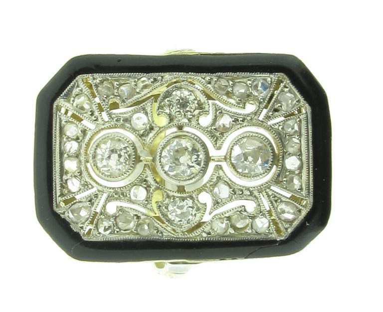 An Edwardian diamond and black enamel ring. The scroll pierced octagonal ring set with diamonds and within a black enamel border. Gold, size S.