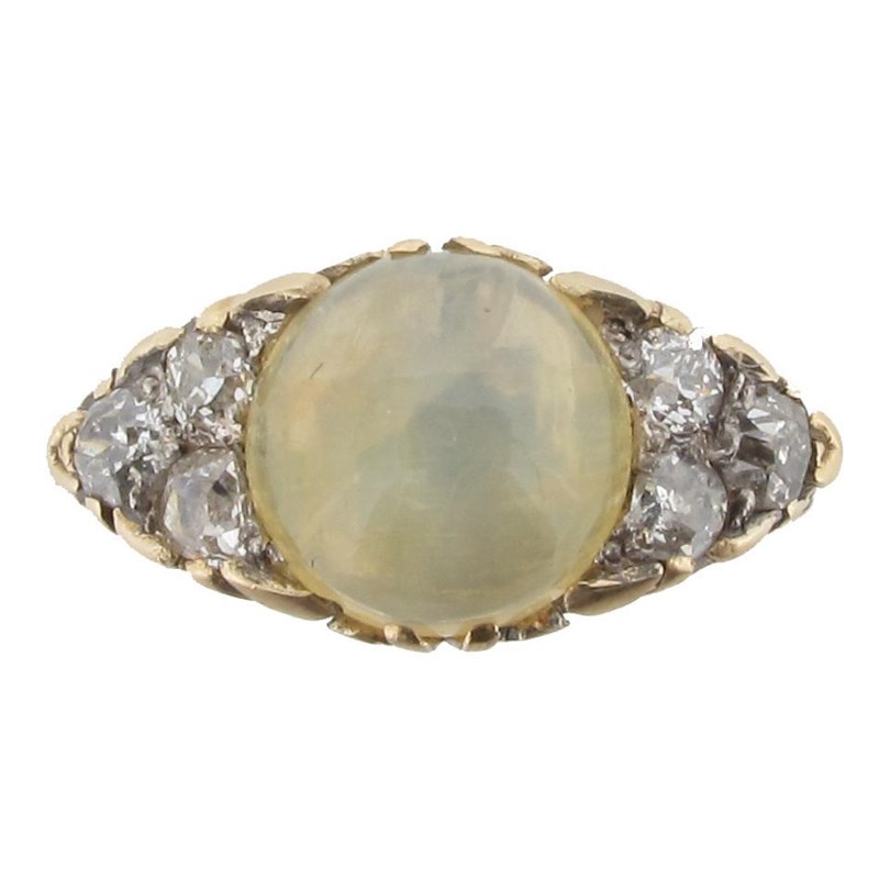 A chrysoberyl catseye and diamond ring. The circular catseye cabochon is set with six shoulder diamonds in gold with carved shoulders, size N.