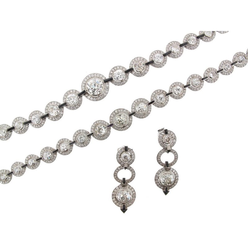 A French suite of diamond and black onyx jewellery Circa 1930. Comprising a necklace, bracelet, and earrings. All mounted with graduated clusters of circular transitional cut diamonds within a surround of smaller diamonds and joined with sections of black onyx. The necklace is centred with a diamond which weighs approximately 2.60 carats and with plain diamond circular links at each end. 41.5cm long. The bracelet is centred with a diamond which weighs 1.20 carats, 18cm long. And the earrings with two diamonds which weigh 1.50 and 1.75 carats. Approximately 40.00 carats in total. Set in platinum. French control mark.