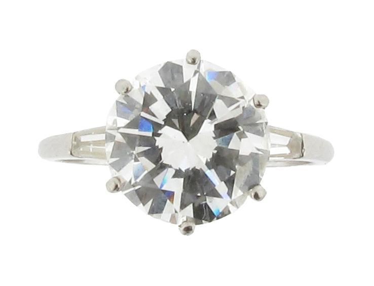 A diamond solitaire ring. The circular brilliant cut diamond weighs 2.96 carats and is set in platinum with two tapered baguette shoulder diamonds, size M.
