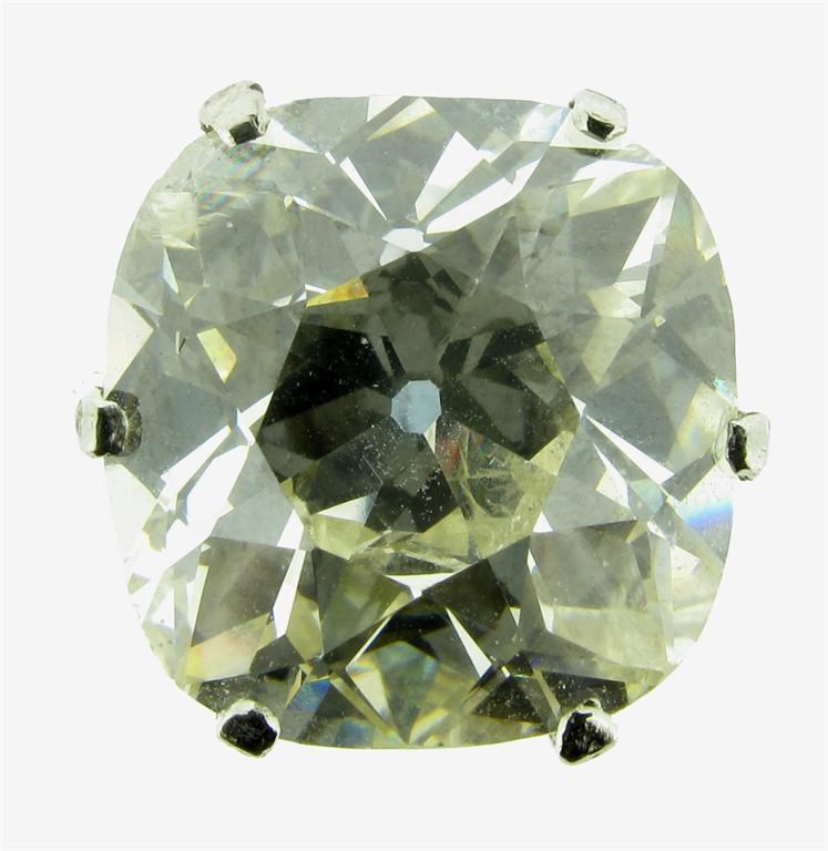 A diamond solitaire ring. The cushion shaped diamond weighs 10.46 carats and is set in platinum