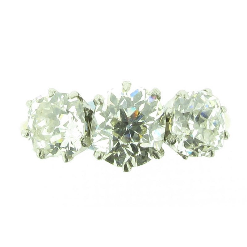 A diamond three stone ring. The three cushion shaped diamonds are set in platinum and gold