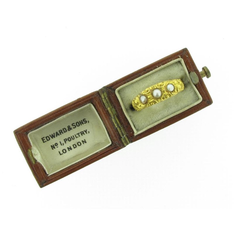 A gold Regency childs ring. Engraved with scroll decoration and set with three seed pearls. Leather case. 1.2cm internal diameter.