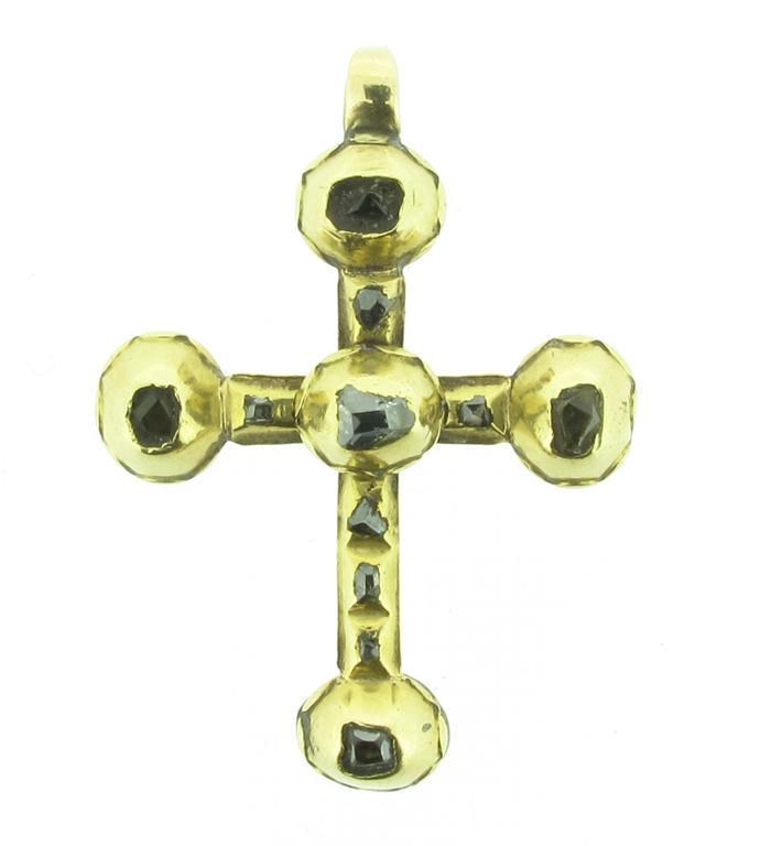 A gold cruciform pendant. Set with crudely cut diamonds. Probably 17th Century. 3.5cm high.