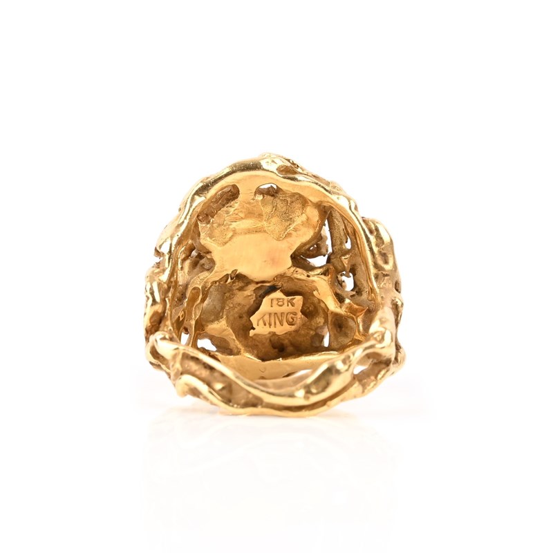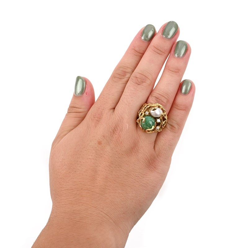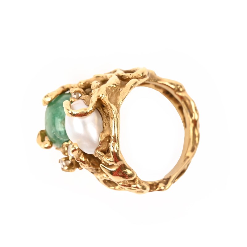 Φ ARTHUR KING, AN EMERALD, DIAMOND AND CULTURED PEARL DRESS RING, 1960s, set with an emerald cabochon and a cultured pearl, within a pierced high surround in textured yellow gold accented with three round brilliant-cut diamonds, signed King, stamped 18K, size N 1/2, gross weight 18g