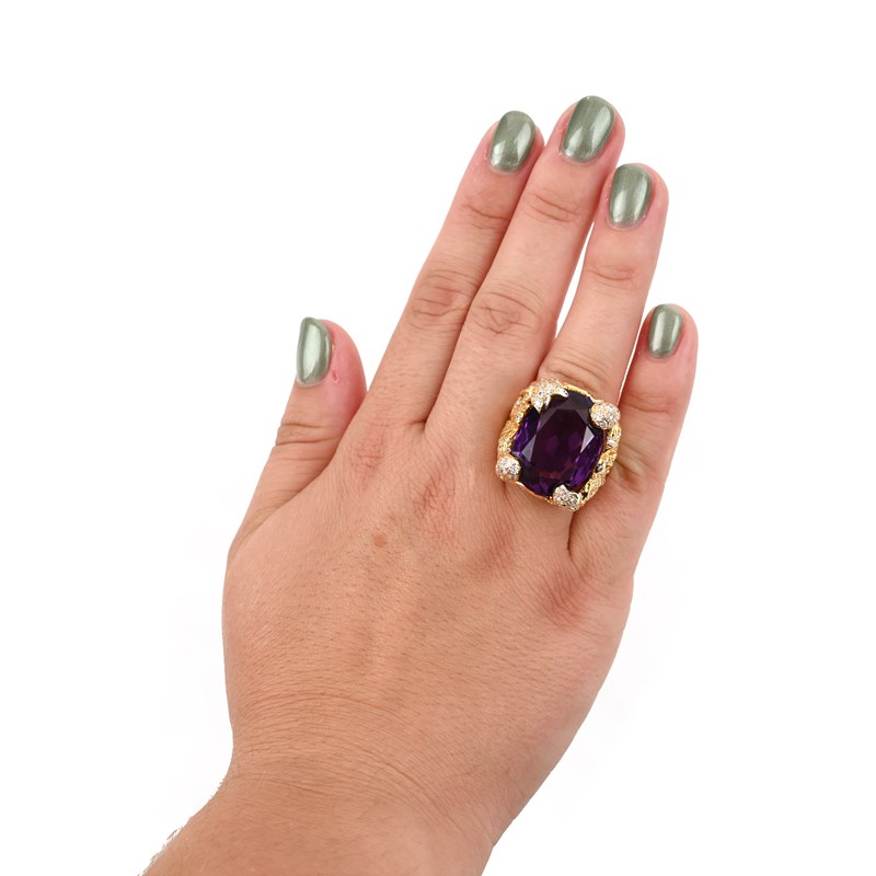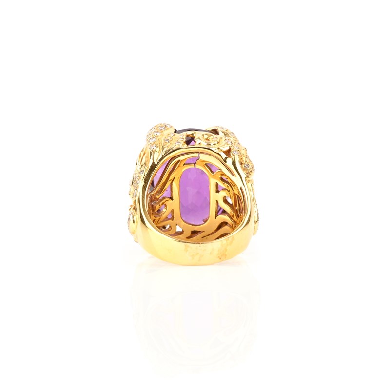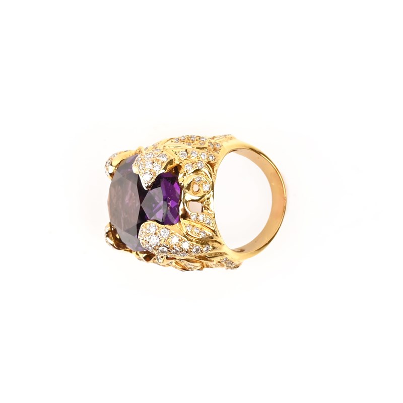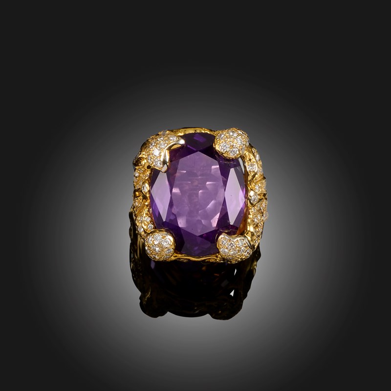 AN AMETHYST AND DIAMOND DRESS RING, the oval-shaped amethyst set with broad organic-shaped claws pavé-set with diamonds, above a high surround of openwork foliate design set with diamonds, mounted in gold, size N 1/2, 26g