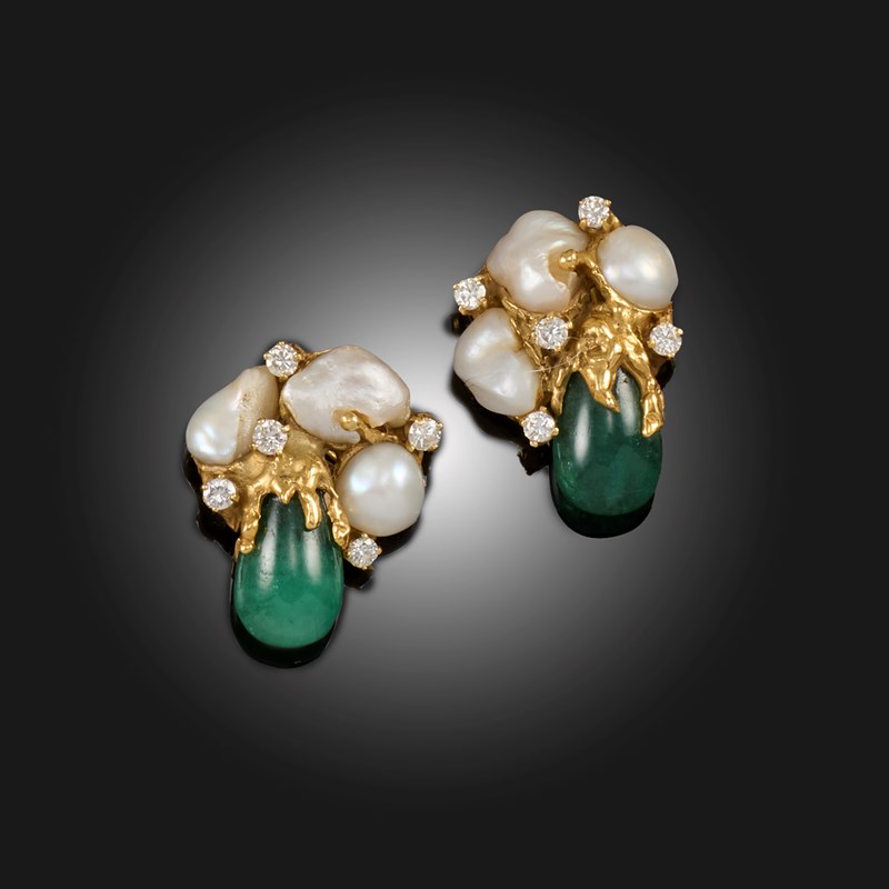 Φ ARTHUR KING, A PAIR OF EMERALD, DIAMOND AND CULTURED PEARL EARCLIPS, CIRCA 1961