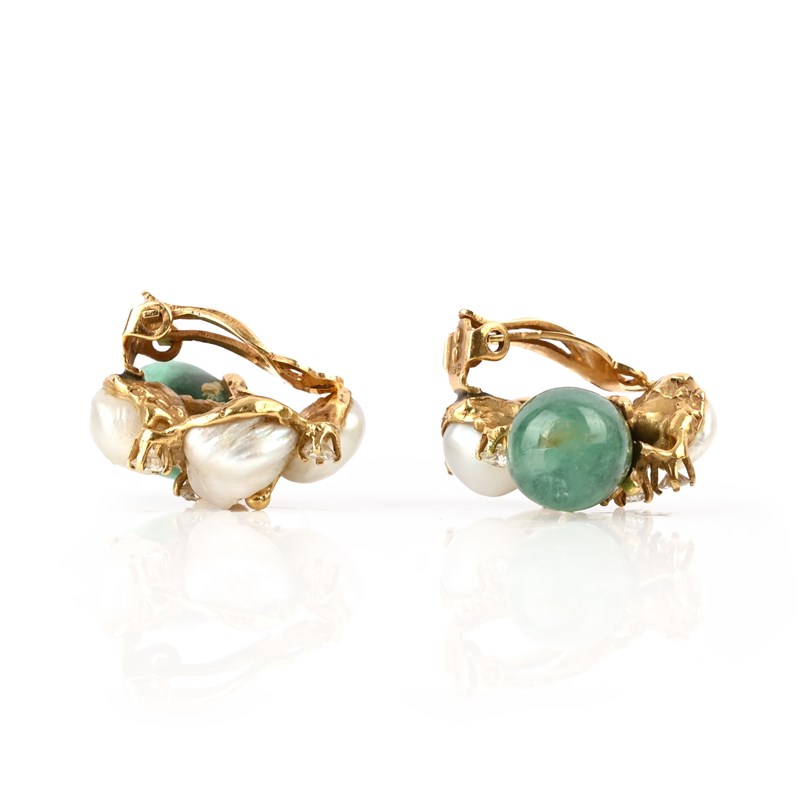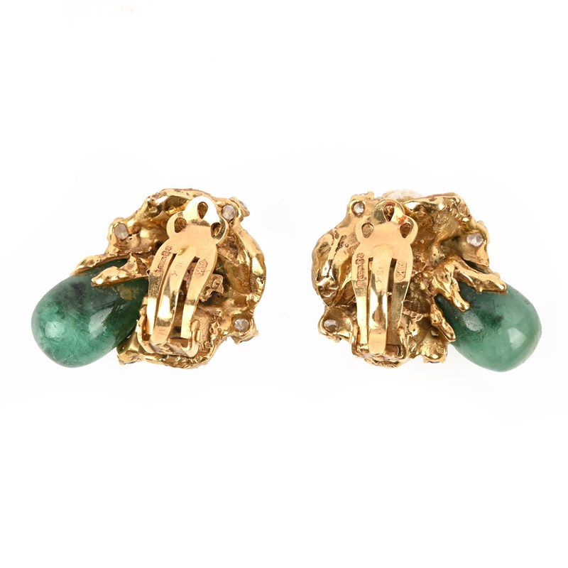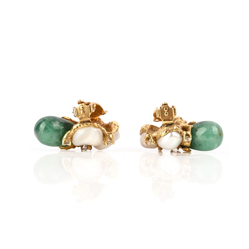 Φ ARTHUR KING, A PAIR OF EMERALD, DIAMOND AND CULTURED PEARL EARCLIPS, CIRCA 1961, set with drop-shaped emerald cabochons and cultured pearls, detailed with textured 18ct yellow gold mounts accented with round brilliant-cut diamonds, maker's mark AK, London import marks for 1961, stamped 18K, clip fittings, length 2.8cm, gross weight 17g