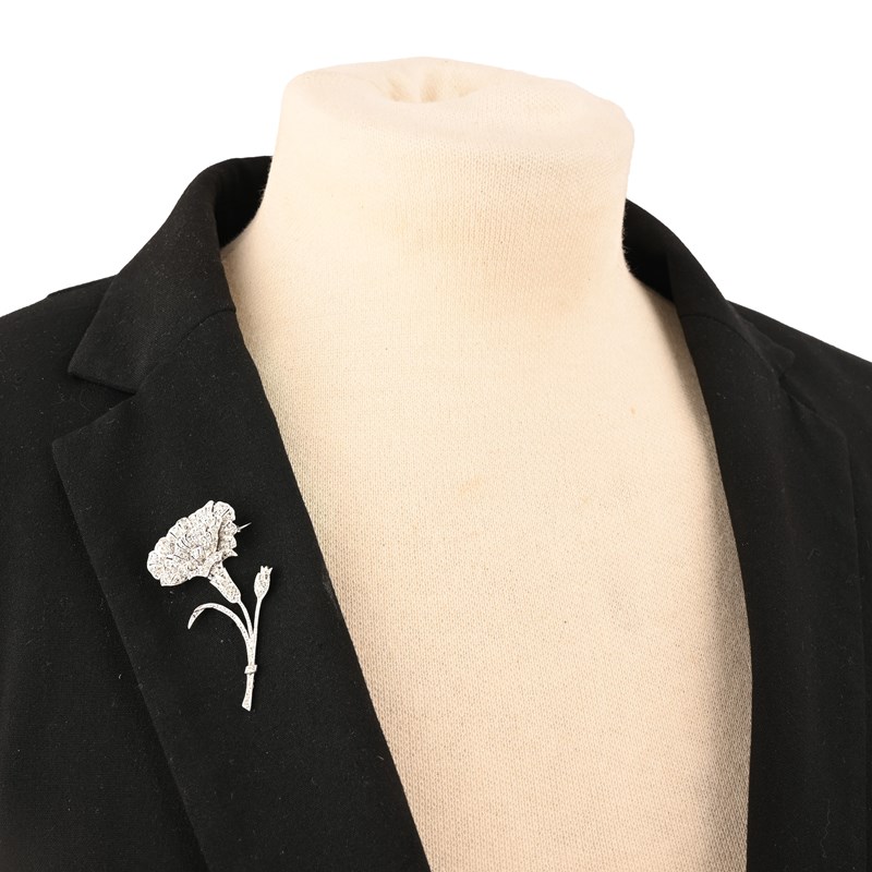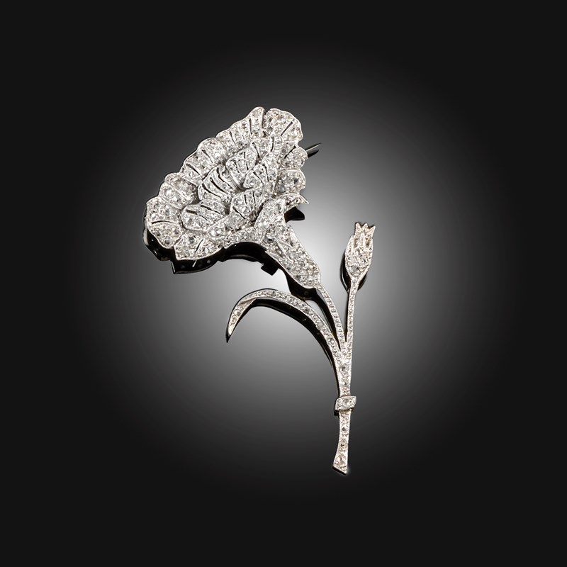 A FRENCH DIAMOND-SET GOLD BROOCH, designed as a carnation, the pierced motif with rose-cut diamonds in millegrain settings, mounted in platinum and gold, French control mark and indistinct maker's mark, length 5cm, gross weight 7g