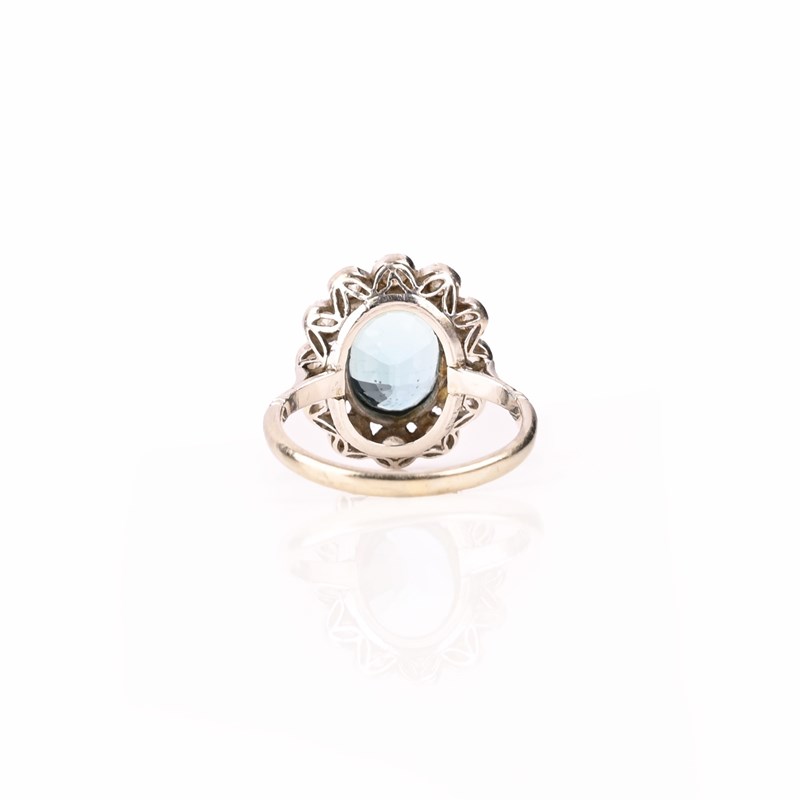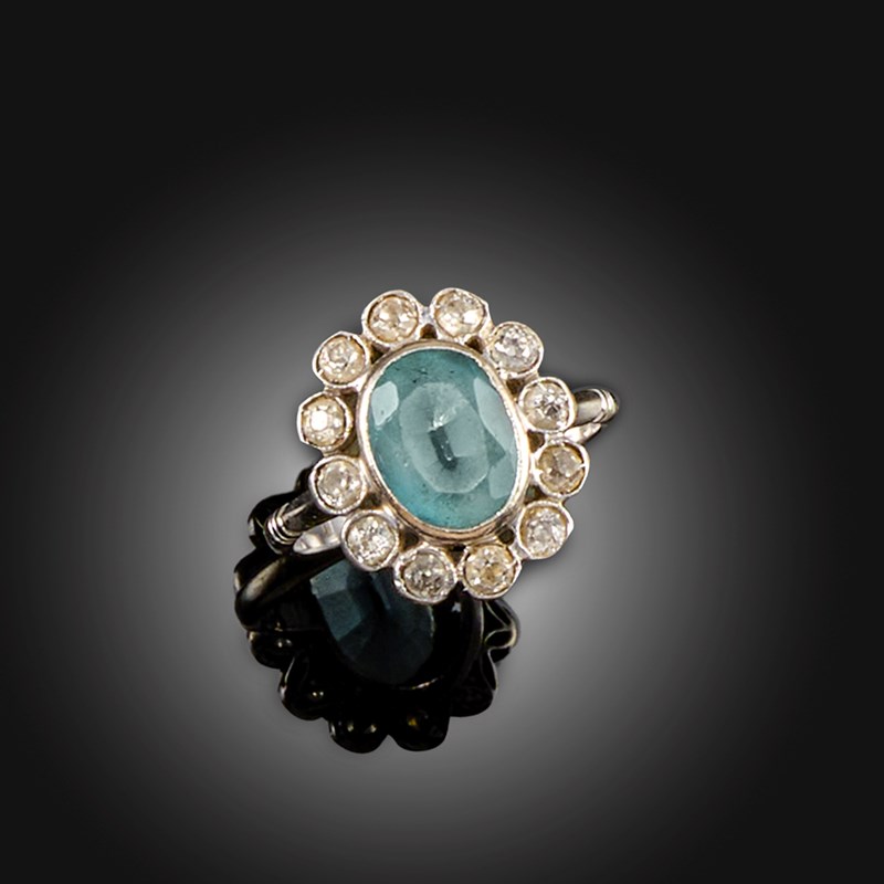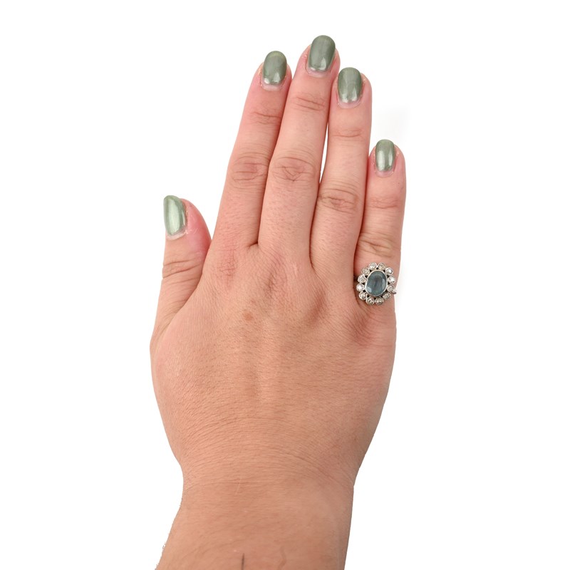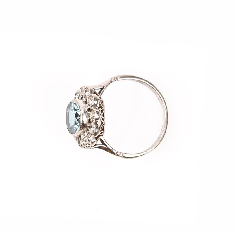 AN AQUAMARINE AND DIAMOND CLUSTER RING